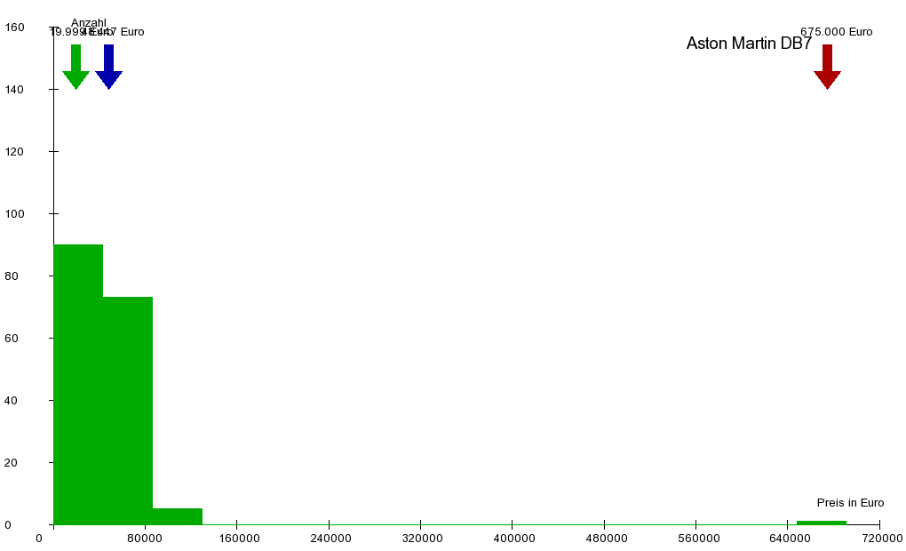 Insgesamt wurden 169 gebrauchte Wagen angeboten. Davon wurden im Beobachtungszeitraum seit dem 05.01.2014, d.h. in 55 Monaten 152 Wagen verkauft. Dies bedeutet einen durchschnittlichen Umsatz von ca. 3 Wagen pro Monat. Das Durchschittsalter beträgt 17 Jahre und 6 Monate. Dies bedeutet bei einer durchschnittlichen Gesamtfahrleistung eines DB7 von 64.090 km eine durchschnittliche Kilometerleistung von 3.667 km pro Jahr. Der Durchschnittspreis der Angebote beträgt: