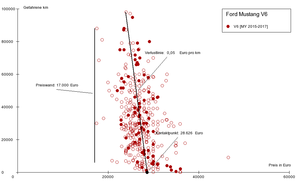 Folgt man der Verlustlinie in die andere Richtung, endet sie theoretisch bei einer sehr hohen Fahrleistung irgendwann bei 0 €. Aber nicht für alle Fahrzeugtypen, insbesondere nicht für die höherwertigen. Bei diesen Fahrzeugtypen gibt es nämlich einen Grenzpreis, der nicht unterschritten wird, egal wie hoch die Fahrleistung ist. Dies ist in diesem Fall als Preiswand eingezeichnet. Die Preiswand liegt hier bei 17.000 €. Unterhalb dieses Preises wurde im Beobachtungszeitraum noch nie ein (voll funktionstüchtiges) Fahrzeug angeboten.