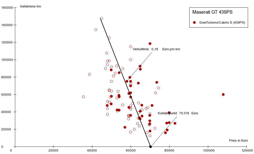 Die Verlustlinie endet unten auf der x-Achse am sogenannten Kontaktpunkt, hier bei 70.316 €. Der Kontaktpunkt ist für Fahrzeuge interessant, für die noch Neufahrzeuge angeboten werden. Mit dem Wert des Kontaktpunktes lässt sich der unmittelbare Neuwagenwertverlust abschätzen. Beim Kauf eines Neuwagens, also bei der Umwandlung eines Neuwagens in einen Gebrauchtwagen findet in der Regel ein besonders hoher, überproportionaler Wertverlust statt. Dies äußert sich in der Graphik regelmäßig so, dass die meisten Neuwagenangebote auf der x-Achse rechts vom Kontaktpunkt liegen. Findet man nun ein Angebot eines Neuwagens links vom Kontaktpunkt, bedeutet dies, dass beim Kauf dieses Fahrzeuges kein Neuwagenwertverlust auftritt. Der Grund dafür, dass dieses Angebot so preiswert ist, kann allerdings in der geringeren Ausstattung dieses Neufahrzeugs zu suchen sein.