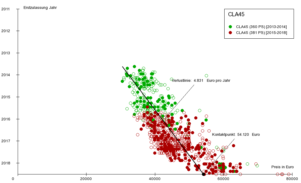 Die Verlustlinie endet unten auf der x-Achse am sogenannten Kontaktpunkt, hier bei 54.132 €. Der Kontaktpunkt ist für Fahrzeuge interessant, für die noch Neufahrzeuge angeboten werden. Mit dem Wert des Kontaktpunktes lässt sich der unmittelbare Neuwagenwertverlust abschätzen. Beim Kauf eines Neuwagens, also bei der Umwandlung eines Neuwagens in einen Gebrauchtwagen findet in der Regel ein besonders hoher, überproportionaler Wertverlust statt. Dies äußert sich in der Graphik regelmäßig so, dass die meisten Neuwagenangebote auf der x-Achse rechts vom Kontaktpunkt liegen. Findet man nun ein Angebot eines Neuwagens links vom Kontaktpunkt, bedeutet dies, dass beim Kauf dieses Fahrzeuges kein Neuwagenwertverlust auftritt. Der Grund dafür, dass dieses Angebot so preiswert ist, kann allerdings in der geringeren Ausstattung dieses Neufahrzeugs zu suchen sein.