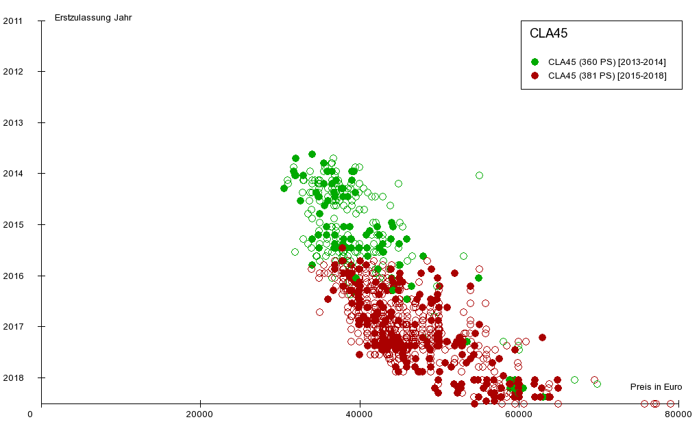 Volle Kreise stehen für aktuelle Angebote, leere Kreise für nicht mehr aktive Angebote, also wahrscheinlich bereits verkaufte Wagen. Die leeren Kreise in in drei Farbstufen dargestellt: Die kräfigte Farbstufe steht für Angebote, die innerhalb des letzten Jahres aktiv waren, die mittlere Farbstufe für Angebote, die innerhalb des vorletzten Jahres aktiv waren und die blasseste Farbstufe für Angebote, die im vorvorletzten Jahr auf dem Markt waren. Angebote, die älter als 3 Jahre sind, werden nicht mehr dargestellt. Klicken Sie auf die Graphik, um sie zu vergrößern!