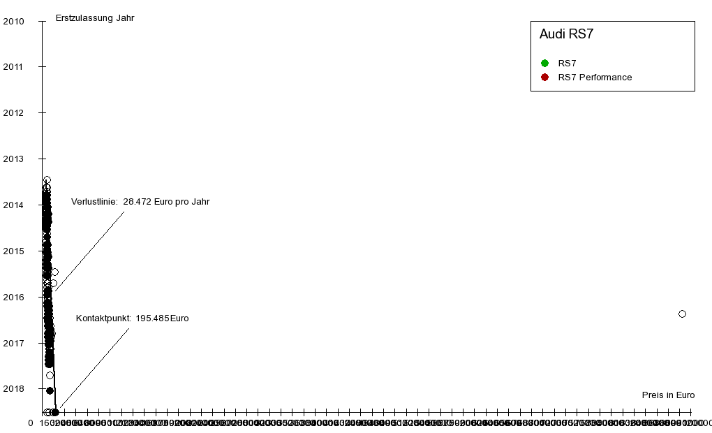 Die Verlustlinie endet unten auf der x-Achse am sogenannten Kontaktpunkt, hier bei 195.485 €. Der Kontaktpunkt ist für Fahrzeuge interessant, für die noch Neufahrzeuge angeboten werden. Mit dem Wert des Kontaktpunktes lässt sich der unmittelbare Neuwagenwertverlust abschätzen. Beim Kauf eines Neuwagens, also bei der Umwandlung eines Neuwagens in einen Gebrauchtwagen findet in der Regel ein besonders hoher, überproportionaler Wertverlust statt. Dies äußert sich in der Graphik regelmäßig so, dass die meisten Neuwagenangebote auf der x-Achse rechts vom Kontaktpunkt liegen. Findet man nun ein Angebot eines Neuwagens links vom Kontaktpunkt, bedeutet dies, dass beim Kauf dieses Fahrzeuges kein Neuwagenwertverlust auftritt. Der Grund dafür, dass dieses Angebot so preiswert ist, kann allerdings in der geringeren Ausstattung dieses Neufahrzeugs zu suchen sein.