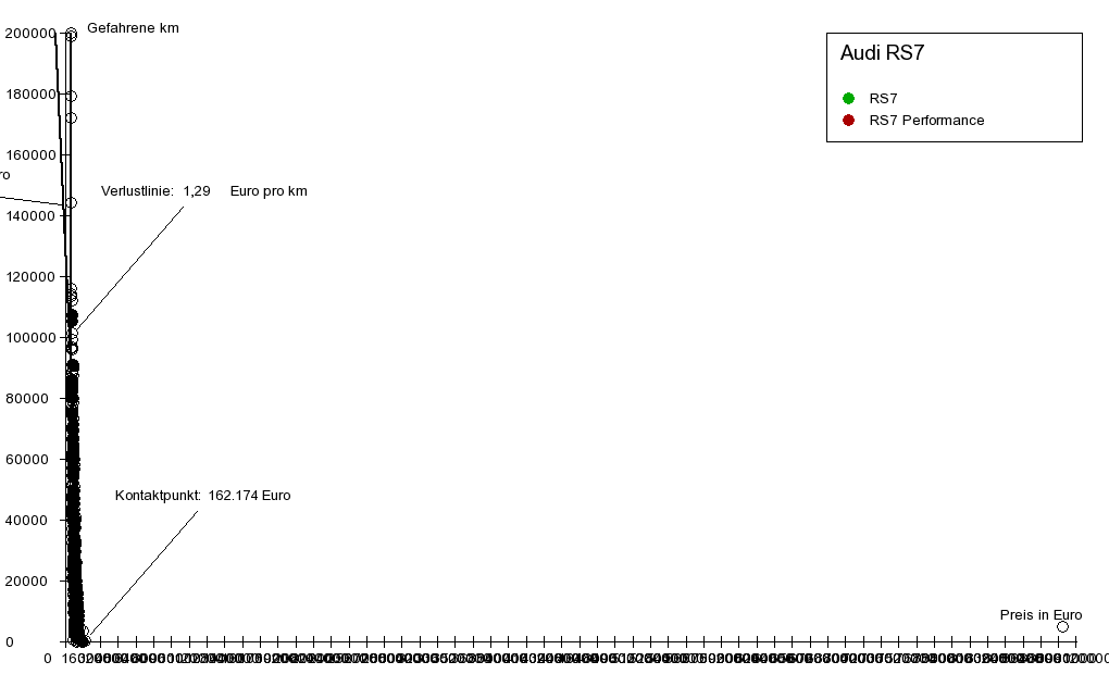 Die Verlustlinie endet unten auf der x-Achse am sogenannten Kontaktpunkt, hier bei 162.174 €. Der Kontaktpunkt ist für Fahrzeuge interessant, für die noch Neufahrzeuge angeboten werden. Mit dem Wert des Kontaktpunktes lässt sich der unmittelbare Neuwagenwertverlust abschätzen. Beim Kauf eines Neuwagens, also bei der Umwandlung eines Neuwagens in einen Gebrauchtwagen findet in der Regel ein besonders hoher, überproportionaler Wertverlust statt. Dies äußert sich in der Graphik regelmäßig so, dass die meisten Neuwagenangebote auf der x-Achse rechts vom Kontaktpunkt liegen. Findet man nun ein Angebot eines Neuwagens links vom Kontaktpunkt, bedeutet dies, dass beim Kauf dieses Fahrzeuges kein Neuwagenwertverlust auftritt. Der Grund dafür, dass dieses Angebot so preiswert ist, kann allerdings in der geringeren Ausstattung dieses Neufahrzeugs zu suchen sein.