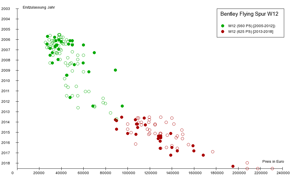 Volle Kreise stehen für aktuelle Angebote, leere Kreise für nicht mehr aktive Angebote, also wahrscheinlich bereits verkaufte Wagen. Die leeren Kreise in in drei Farbstufen dargestellt: Die kräfigte Farbstufe steht für Angebote, die innerhalb des letzten Jahres aktiv waren, die mittlere Farbstufe für Angebote, die innerhalb des vorletzten Jahres aktiv waren und die blasseste Farbstufe für Angebote, die im vorvorletzten Jahr auf dem Markt waren. Angebote, die älter als 3 Jahre sind, werden nicht mehr dargestellt. Klicken Sie auf die Graphik, um sie zu vergrößern!