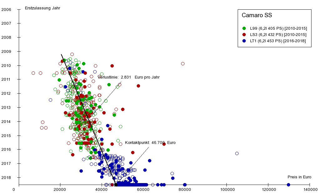 Die Verlustlinie endet unten auf der x-Achse am sogenannten Kontaktpunkt, hier bei 46.700 €. Der Kontaktpunkt ist für Fahrzeuge interessant, für die noch Neufahrzeuge angeboten werden. Mit dem Wert des Kontaktpunktes lässt sich der unmittelbare Neuwagenwertverlust abschätzen. Beim Kauf eines Neuwagens, also bei der Umwandlung eines Neuwagens in einen Gebrauchtwagen findet in der Regel ein besonders hoher, überproportionaler Wertverlust statt. Dies äußert sich in der Graphik regelmäßig so, dass die meisten Neuwagenangebote auf der x-Achse rechts vom Kontaktpunkt liegen. Findet man nun ein Angebot eines Neuwagens links vom Kontaktpunkt, bedeutet dies, dass beim Kauf dieses Fahrzeuges kein Neuwagenwertverlust auftritt. Der Grund dafür, dass dieses Angebot so preiswert ist, kann allerdings in der geringeren Ausstattung dieses Neufahrzeugs zu suchen sein.