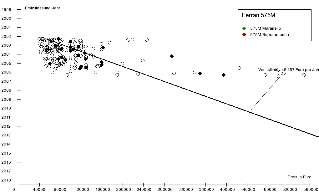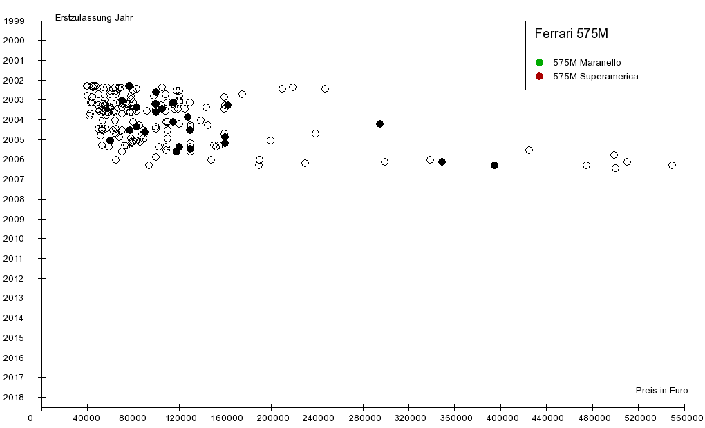 Seit dem 16.06.2013 wird der Ferrari 575M überwacht. Seitdem wurden insgesamt 191 Wagen beobachtet. Davon wurden 166 (offene Punkte) verkauft und 25 (volle Punkte) befinden sich noch auf dem Markt.