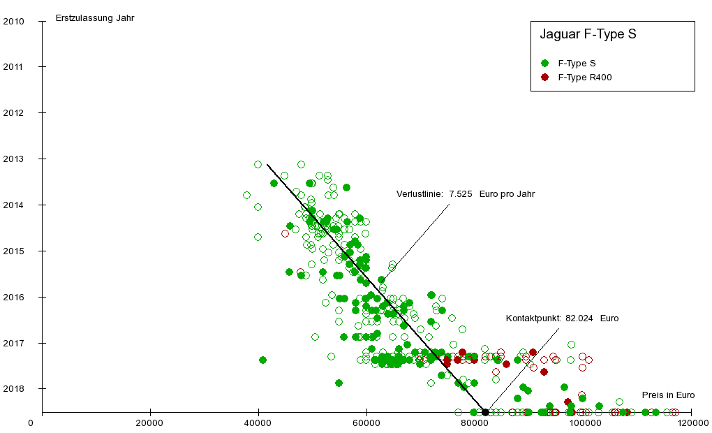 Die Verlustlinie endet unten auf der x-Achse am sogenannten Kontaktpunkt, hier bei 82.024 €. Der Kontaktpunkt ist für Fahrzeuge interessant, für die noch Neufahrzeuge angeboten werden. Mit dem Wert des Kontaktpunktes lässt sich der unmittelbare Neuwagenwertverlust abschätzen. Beim Kauf eines Neuwagens, also bei der Umwandlung eines Neuwagens in einen Gebrauchtwagen findet in der Regel ein besonders hoher, überproportionaler Wertverlust statt. Dies äußert sich in der Graphik regelmäßig so, dass die meisten Neuwagenangebote auf der x-Achse rechts vom Kontaktpunkt liegen. Findet man nun ein Angebot eines Neuwagens links vom Kontaktpunkt, bedeutet dies, dass beim Kauf dieses Fahrzeuges kein Neuwagenwertverlust auftritt. Der Grund dafür, dass dieses Angebot so preiswert ist, kann allerdings in der geringeren Ausstattung dieses Neufahrzeugs zu suchen sein.