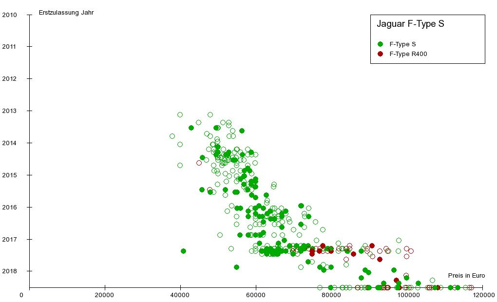 Seit dem 03.01.2018 wird der Jaguar F-Type S überwacht. Seitdem wurden insgesamt 442 Autos beobachtet. Davon wurden 298 (offene Punkte) verkauft und 144 (volle Punkte) befinden sich noch auf dem Markt.