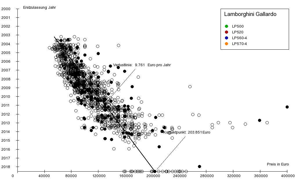 Die Verlustlinie endet unten auf der x-Achse am sogenannten Kontaktpunkt, hier bei 203.851 €. Der Kontaktpunkt ist für Fahrzeuge interessant, für die noch Neufahrzeuge angeboten werden. Mit dem Wert des Kontaktpunktes lässt sich der unmittelbare Neuwagenwertverlust abschätzen. Beim Kauf eines Neuwagens, also bei der Umwandlung eines Neuwagens in einen Gebrauchtwagen findet in der Regel ein besonders hoher, überproportionaler Wertverlust statt. Dies äußert sich in der Graphik regelmäßig so, dass die meisten Neuwagenangebote auf der x-Achse rechts vom Kontaktpunkt liegen. Findet man nun ein Angebot eines Neuwagens links vom Kontaktpunkt, bedeutet dies, dass beim Kauf dieses Fahrzeuges kein Neuwagenwertverlust auftritt. Der Grund dafür, dass dieses Angebot so preiswert ist, kann allerdings in der geringeren Ausstattung dieses Neufahrzeugs zu suchen sein.