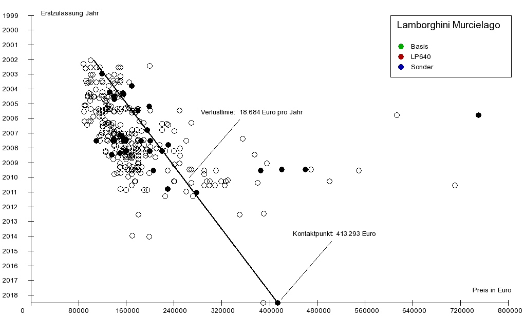 Die Verlustlinie endet unten auf der x-Achse am sogenannten Kontaktpunkt, hier bei 413.293 €. Der Kontaktpunkt ist für Fahrzeuge interessant, für die noch Neufahrzeuge angeboten werden. Mit dem Wert des Kontaktpunktes lässt sich der unmittelbare Neuwagenwertverlust abschätzen. Beim Kauf eines Neuwagens, also bei der Umwandlung eines Neuwagens in einen Gebrauchtwagen findet in der Regel ein besonders hoher, überproportionaler Wertverlust statt. Dies äußert sich in der Graphik regelmäßig so, dass die meisten Neuwagenangebote auf der x-Achse rechts vom Kontaktpunkt liegen. Findet man nun ein Angebot eines Neuwagens links vom Kontaktpunkt, bedeutet dies, dass beim Kauf dieses Fahrzeuges kein Neuwagenwertverlust auftritt. Der Grund dafür, dass dieses Angebot so preiswert ist, kann allerdings in der geringeren Ausstattung dieses Neufahrzeugs zu suchen sein.