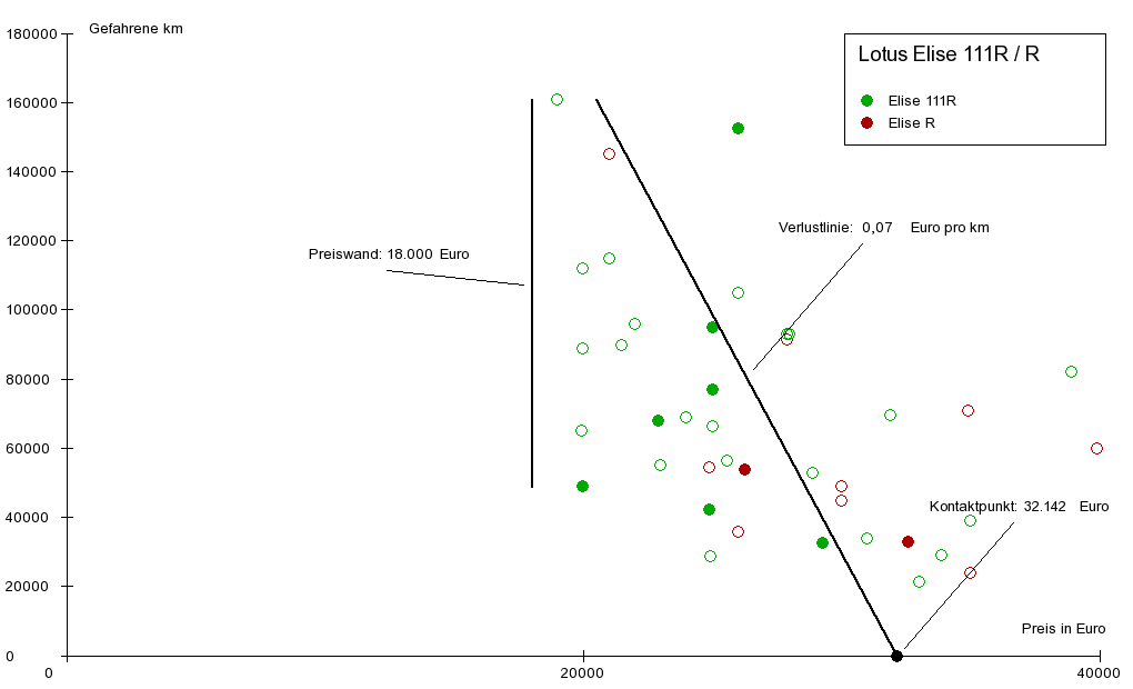 Die Verlustlinie endet unten auf der x-Achse am sogenannten Kontaktpunkt, hier bei 32.142 €. Der Kontaktpunkt ist für Fahrzeuge interessant, für die noch Neufahrzeuge angeboten werden. Mit dem Wert des Kontaktpunktes lässt sich der unmittelbare Neuwagenwertverlust abschätzen. Beim Kauf eines Neuwagens, also bei der Umwandlung eines Neuwagens in einen Gebrauchtwagen findet in der Regel ein besonders hoher, überproportionaler Wertverlust statt. Dies äußert sich in der Graphik regelmäßig so, dass die meisten Neuwagenangebote auf der x-Achse rechts vom Kontaktpunkt liegen. Findet man nun ein Angebot eines Neuwagens links vom Kontaktpunkt, bedeutet dies, dass beim Kauf dieses Fahrzeuges kein Neuwagenwertverlust auftritt. Der Grund dafür, dass dieses Angebot so preiswert ist, kann allerdings in der geringeren Ausstattung dieses Neufahrzeugs zu suchen sein.