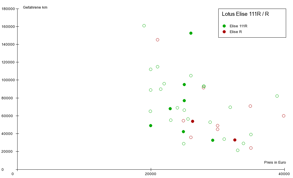 Seit dem 19.09.2017 wird der Lotus Elise 111R / R überwacht. Seitdem wurden insgesamt 40 Wagen beobachtet. Davon wurden 31 (offene Punkte) verkauft und 9 (volle Punkte) befinden sich noch auf dem Markt.