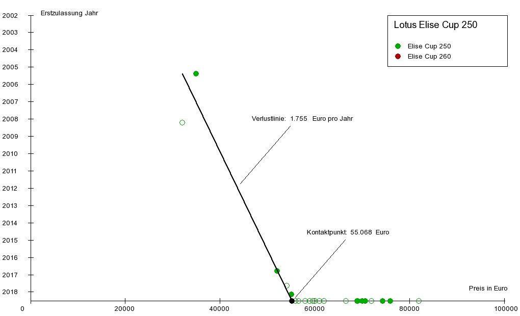 Die Verlustlinie endet unten auf der x-Achse am sogenannten Kontaktpunkt, hier bei 55.068 €. Der Kontaktpunkt ist für Fahrzeuge interessant, für die noch Neufahrzeuge angeboten werden. Mit dem Wert des Kontaktpunktes lässt sich der unmittelbare Neuwagenwertverlust abschätzen. Beim Kauf eines Neuwagens, also bei der Umwandlung eines Neuwagens in einen Gebrauchtwagen findet in der Regel ein besonders hoher, überproportionaler Wertverlust statt. Dies äußert sich in der Graphik regelmäßig so, dass die meisten Neuwagenangebote auf der x-Achse rechts vom Kontaktpunkt liegen. Findet man nun ein Angebot eines Neuwagens links vom Kontaktpunkt, bedeutet dies, dass beim Kauf dieses Fahrzeuges kein Neuwagenwertverlust auftritt. Der Grund dafür, dass dieses Angebot so preiswert ist, kann allerdings in der geringeren Ausstattung dieses Neufahrzeugs zu suchen sein.