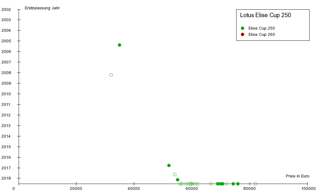 Seit dem 19.09.2017 wird der Lotus Elise Cup 250 überwacht. Seitdem wurden insgesamt 25 Autos beobachtet. Davon wurden 15 (offene Punkte) verkauft und 10 (volle Punkte) befinden sich noch auf dem Markt.