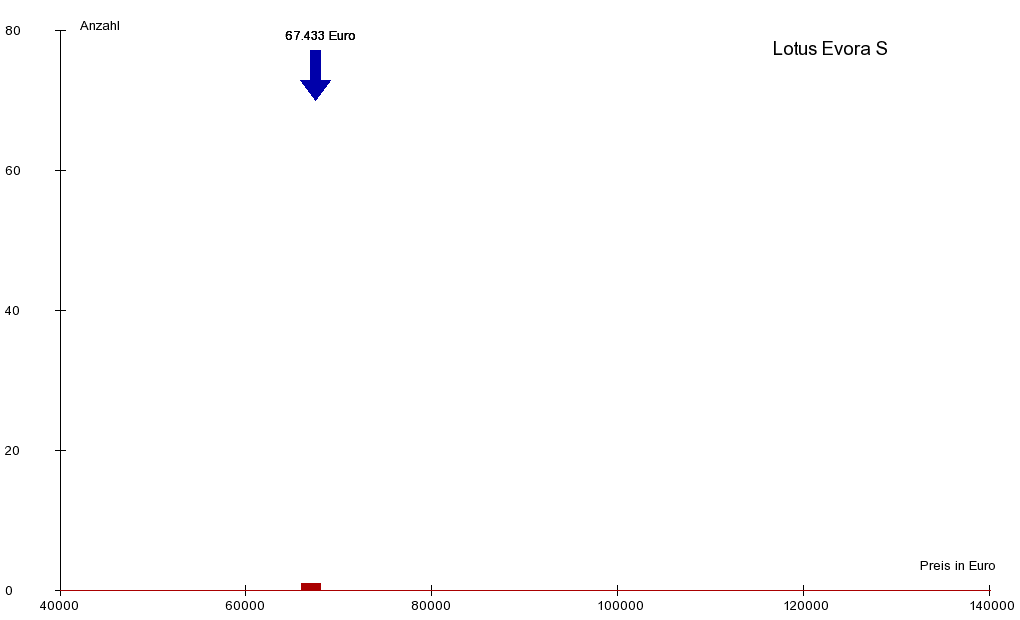 Insgesamt wurden im Beobachtungszeitraum 25 gebrauchte Wagen angeboten. Davon wurden innerhalb von 10 Monaten 17 Wagen verkauft. Dies bedeutet einen durchschnittlichen Umsatz von ca. 0 Wagen pro Woche. Das Durchschittsalter beträgt 6 Jahre und 1 Monate bei einer durchschnittlichen Kilometerleistung von 5.624 km pro Jahr. Der Durchschnittspreis der Angebote für gebrauchte Lotus Evora S beträgt: