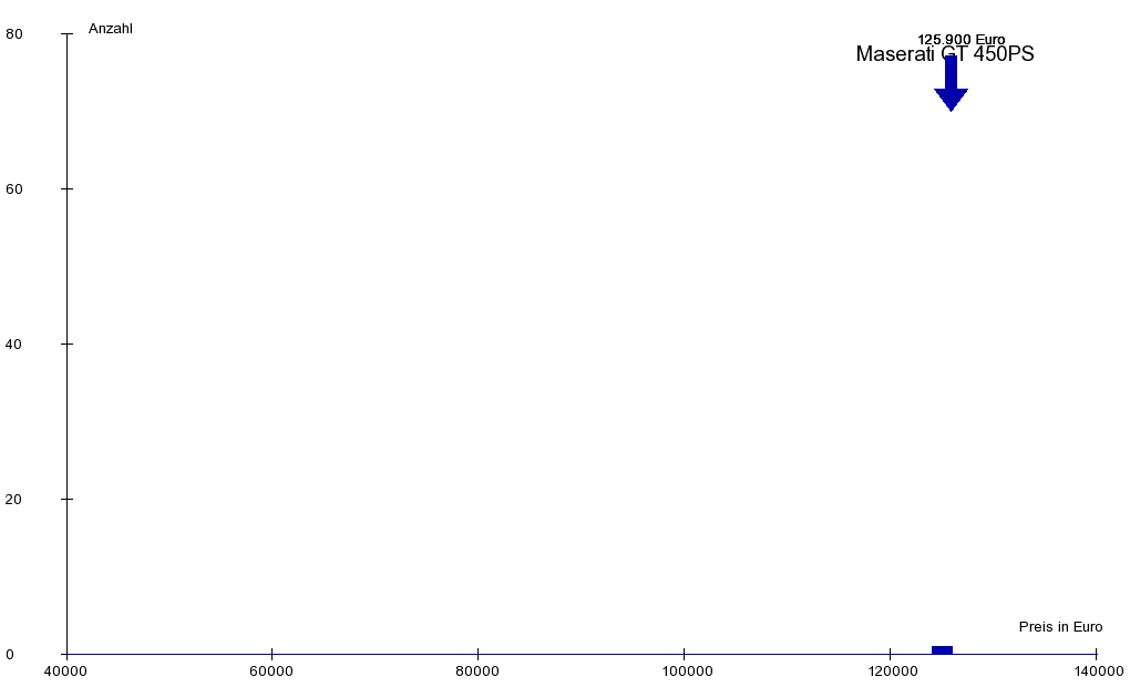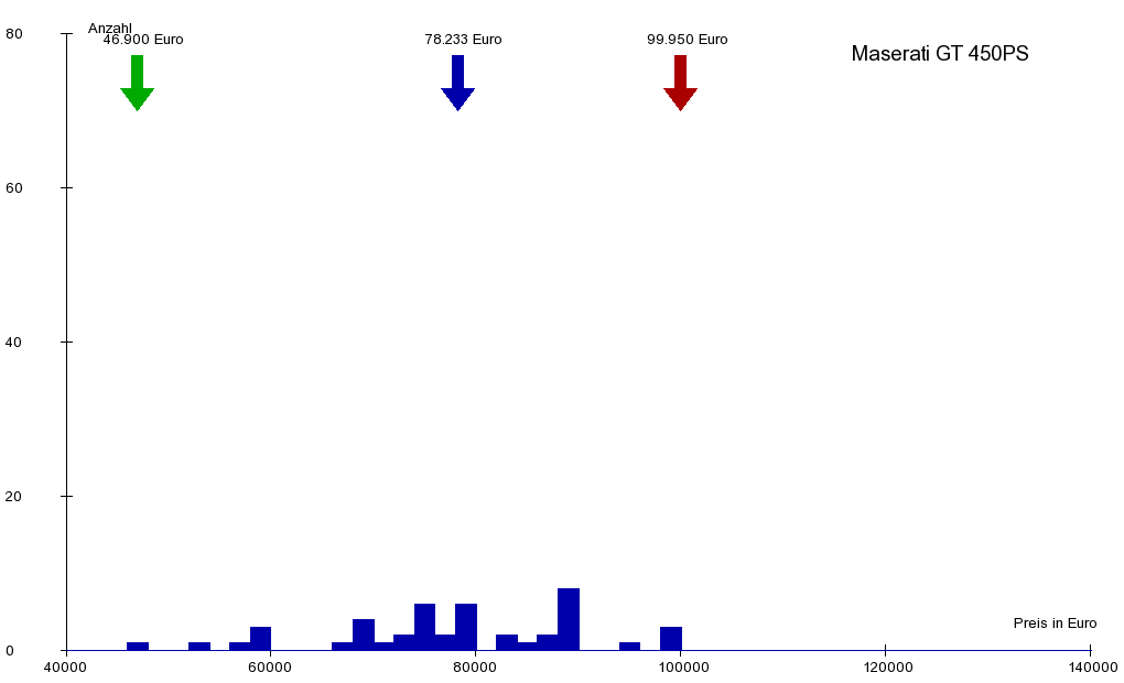 Insgesamt erfasst das AutoWertRadar 45 gebrauchte Maserati Gran GT 450 im Beobachtungszeitraum der letzten 6 Monaten. Davon wurden 31 Wagen verkauft. Dies bedeutet einen durchschnittlichen Umsatz von ca. 1 Wagen pro Woche. Das Durchschittsalter beträgt 5 Jahre und 11 Monate bei einer durchschnittlichen Kilometerleistung von 6.382 km. Der Durchschnittspreis der Angebote beträgt: