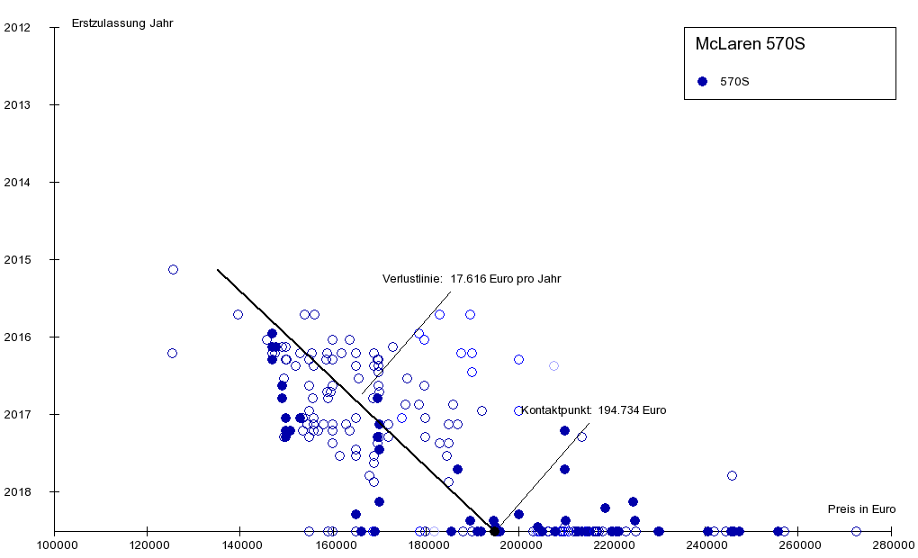 Die Verlustlinie endet unten auf der x-Achse am sogenannten Kontaktpunkt, hier bei 194.734 €. Der Kontaktpunkt ist für Fahrzeuge interessant, für die noch Neufahrzeuge angeboten werden. Mit dem Wert des Kontaktpunktes lässt sich der unmittelbare Neuwagenwertverlust abschätzen. Beim Kauf eines Neuwagens, also bei der Umwandlung eines Neuwagens in einen Gebrauchtwagen findet in der Regel ein besonders hoher, überproportionaler Wertverlust statt. Dies äußert sich in der Graphik regelmäßig so, dass die meisten Neuwagenangebote auf der x-Achse rechts vom Kontaktpunkt liegen. Findet man nun ein Angebot eines Neuwagens links vom Kontaktpunkt, bedeutet dies, dass beim Kauf dieses Fahrzeuges kein Neuwagenwertverlust auftritt. Der Grund dafür, dass dieses Angebot so preiswert ist, kann allerdings in der geringeren Ausstattung dieses Neufahrzeugs zu suchen sein.