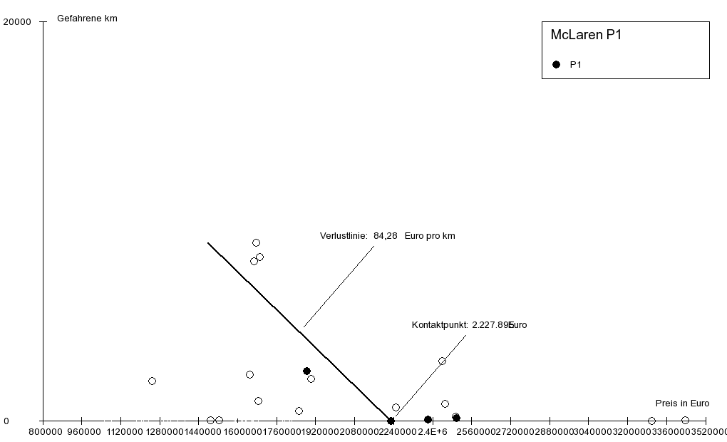 Die Verlustlinie endet unten auf der x-Achse am sogenannten Kontaktpunkt, hier bei 2.227.895 €. Der Kontaktpunkt ist für Fahrzeuge interessant, für die noch Neufahrzeuge angeboten werden. Mit dem Wert des Kontaktpunktes lässt sich der unmittelbare Neuwagenwertverlust abschätzen. Beim Kauf eines Neuwagens, also bei der Umwandlung eines Neuwagens in einen Gebrauchtwagen findet in der Regel ein besonders hoher, überproportionaler Wertverlust statt. Dies äußert sich in der Graphik regelmäßig so, dass die meisten Neuwagenangebote auf der x-Achse rechts vom Kontaktpunkt liegen. Findet man nun ein Angebot eines Neuwagens links vom Kontaktpunkt, bedeutet dies, dass beim Kauf dieses Fahrzeuges kein Neuwagenwertverlust auftritt. Der Grund dafür, dass dieses Angebot so preiswert ist, kann allerdings in der geringeren Ausstattung dieses Neufahrzeugs zu suchen sein.