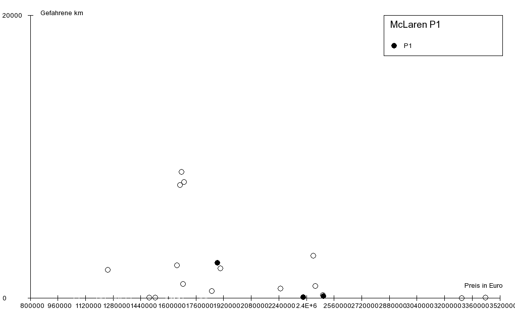 Seit dem 06.01.2014 wird der McLaren P1 überwacht. Seitdem wurden insgesamt 38 Wagen beobachtet. Davon wurden 35 (offene Punkte) verkauft und 3 (volle Punkte) befinden sich noch auf dem Markt.