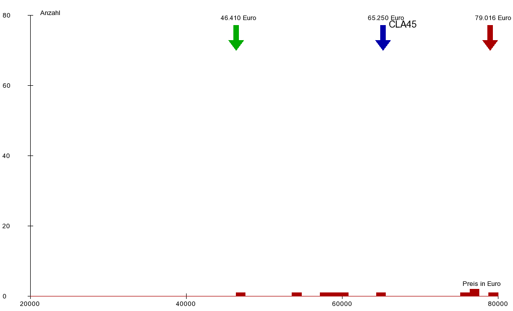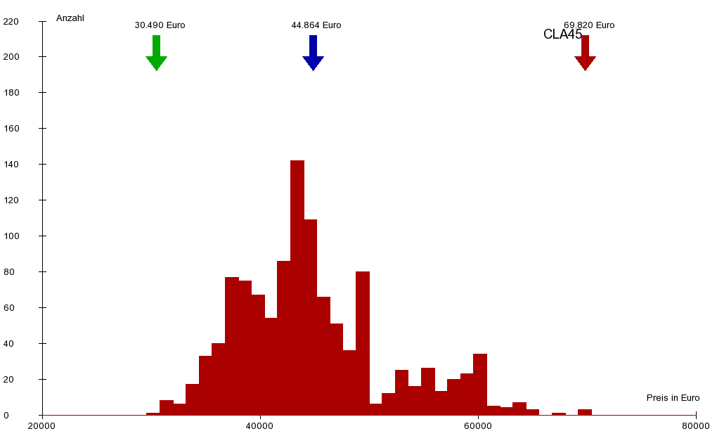Insgesamt wurden im Beobachtungszeitraum 1144 gebrauchte Wagen angeboten. Davon wurden innerhalb von 5 Monaten 804 Wagen verkauft. Dies bedeutet einen durchschnittlichen Umsatz von ca. 41 Wagen pro Woche. Das Durchschittsalter beträgt 1 Jahre und 11 Monate bei einer durchschnittlichen Kilometerleistung von 14.401 km pro Jahr. Der Durchschnittspreis der Angebote für gebrauchte Mercedes-AMG CLA 45 beträgt: