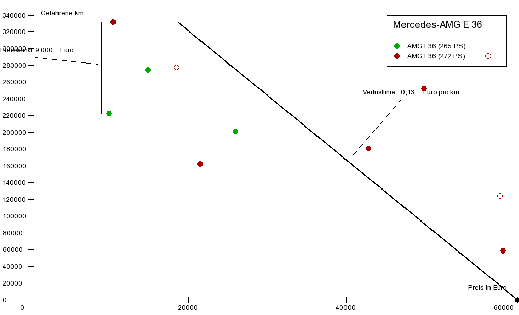 Diesem Trend folgt die eingezeichnete Verlustlinie. Sie spiegelt die durchschnittliche Beziehung zwischen Kilometerleistung und Preis wieder. Die hier eingezeichnete Verlustlinie weist ein Gefälle von 13 Cent pro Kilometer aus. Das bedeutet: Jeder Kilometer, der mit einem durchschnittlichen Fahrzeug zurückgelegt wird, führt im Durchschnitt zu einem Wertverlust von 13 Cent, unabhängig von der Kilometerleistung.