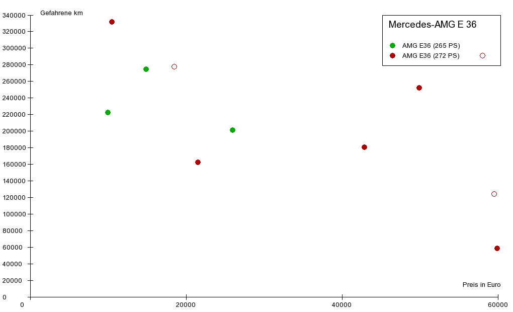 Seit dem 18.02.2018 wird der Mercedes-AMG E 36 überwacht. Seitdem wurden insgesamt 11 Wagen beobachtet. Davon wurden 3 (offene Punkte) verkauft und 8 (volle Punkte) befinden sich noch auf dem Markt.