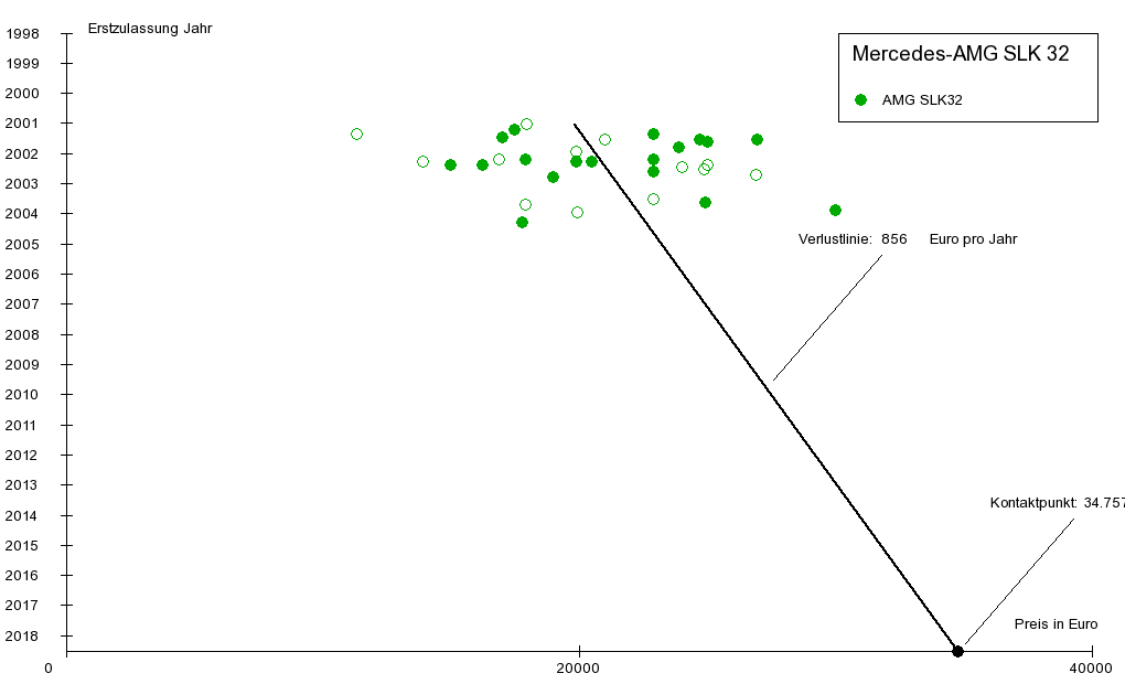 Die Verlustlinie endet unten auf der x-Achse am sogenannten Kontaktpunkt, hier bei 34.757 €. Der Kontaktpunkt ist für Fahrzeuge interessant, für die noch Neufahrzeuge angeboten werden. Mit dem Wert des Kontaktpunktes lässt sich der unmittelbare Neuwagenwertverlust abschätzen. Beim Kauf eines Neuwagens, also bei der Umwandlung eines Neuwagens in einen Gebrauchtwagen findet in der Regel ein besonders hoher, überproportionaler Wertverlust statt. Dies äußert sich in der Graphik regelmäßig so, dass die meisten Neuwagenangebote auf der x-Achse rechts vom Kontaktpunkt liegen. Findet man nun ein Angebot eines Neuwagens links vom Kontaktpunkt, bedeutet dies, dass beim Kauf dieses Fahrzeuges kein Neuwagenwertverlust auftritt. Der Grund dafür, dass dieses Angebot so preiswert ist, kann allerdings in der geringeren Ausstattung dieses Neufahrzeugs zu suchen sein.