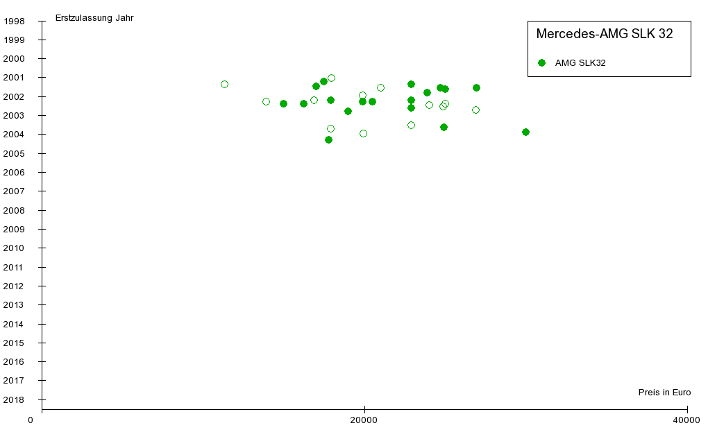 Seit dem 15.02.2018 wird der Mercedes-AMG SLK 32 überwacht. Seitdem wurden insgesamt 31 Autos beobachtet. Davon wurden 13 (offene Punkte) verkauft und 18 (volle Punkte) befinden sich noch auf dem Markt.