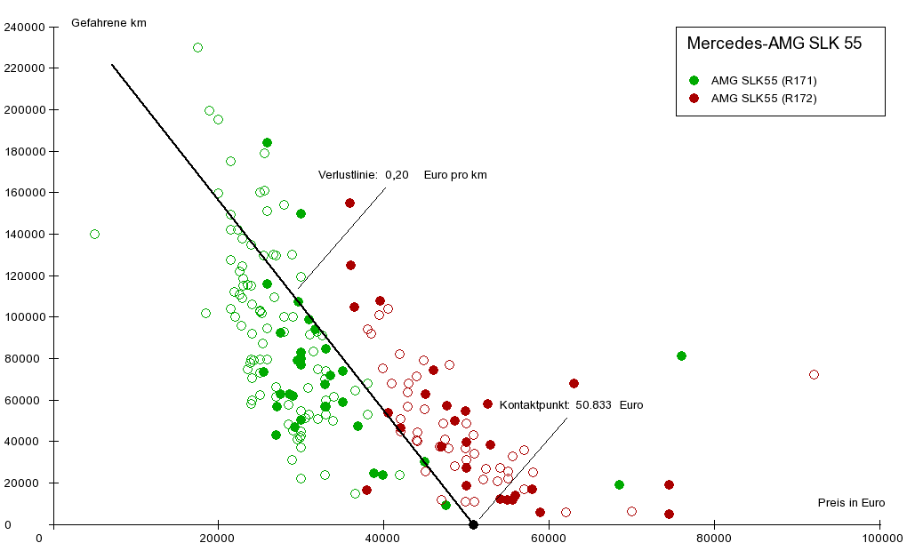 Diesem Trend folgt die eingezeichnete Verlustlinie. Sie spiegelt die durchschnittliche Beziehung zwischen Kilometerleistung und Preis wieder. Die hier eingezeichnete Verlustlinie weist ein Gefälle von 20 Cent pro Kilometer aus. Das bedeutet: Jeder Kilometer, der mit einem durchschnittlichen Fahrzeug zurückgelegt wird, führt im Durchschnitt zu einem Wertverlust von 20 Cent, unabhängig von der Kilometerleistung.