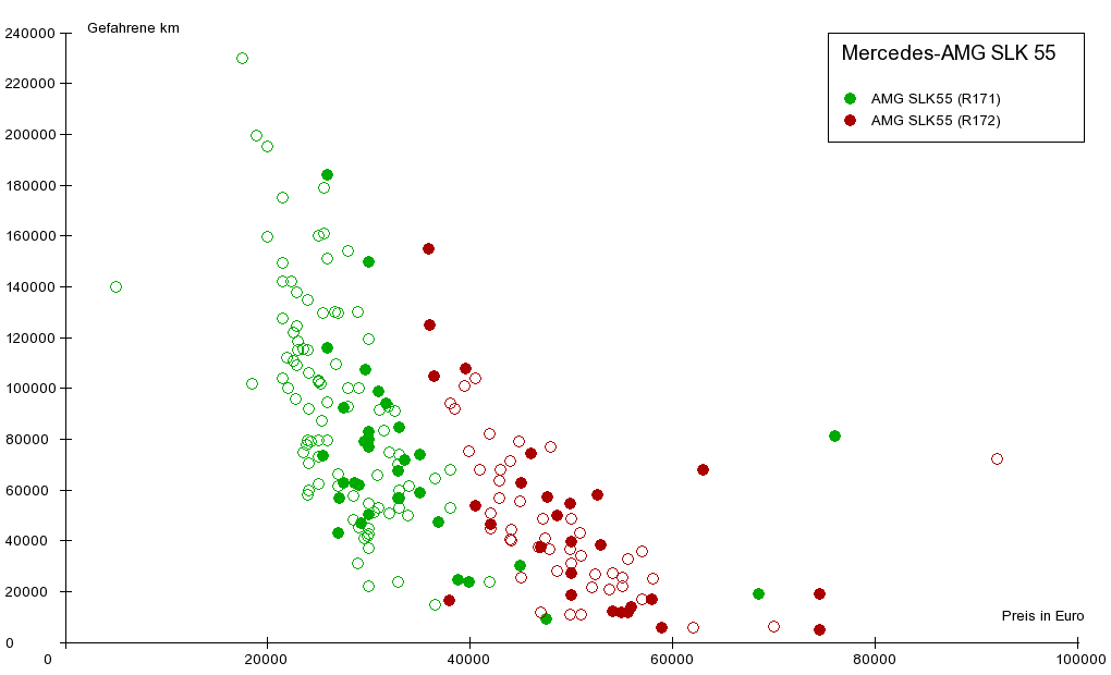 Es wird fast immer ein Trend sichtbar: Die Punkte liegen in einer Zone, die von unten rechts nach links oben läuft, was bedeutet, dass der Angebotspreis der Fahrzeuge mit steigender Kilometerleistung sinkt.