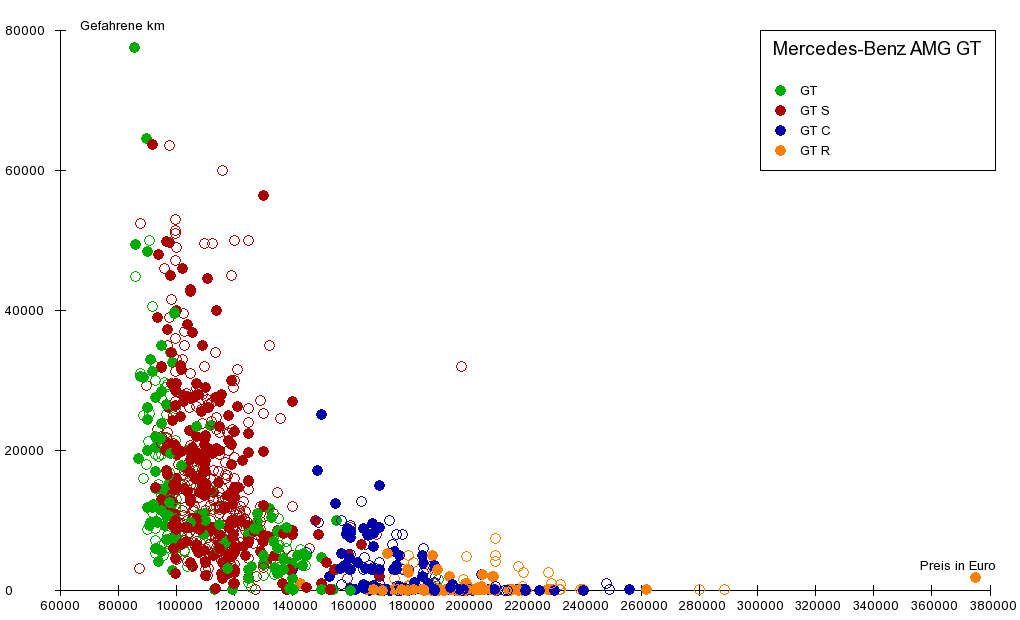 Seit dem 20.08.2017 wird der Mercedes-Benz AMG GT überwacht. Seitdem wurden insgesamt 1025 Wagen beobachtet. Davon wurden 542 (offene Punkte) verkauft und 483 (volle Punkte) befinden sich noch auf dem Markt.