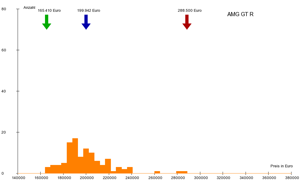 Insgesamt erfasst das AutoWertRadar 37 gebrauchte Mercedes-Benz AMG GT R im Beobachtungszeitraum der letzten 5 Monaten. Davon wurden 23 Wagen verkauft. Dies bedeutet einen durchschnittlichen Umsatz von ca. 1 Wagen pro Woche. Das Durchschittsalter beträgt 0 Jahre und 6 Monate bei einer durchschnittlichen Kilometerleistung von 4.806 km. Der Durchschnittspreis der Angebote beträgt: