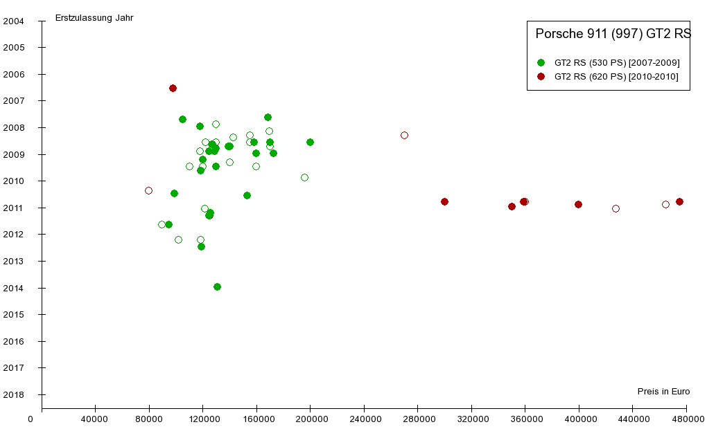 Seit dem 26.01.2018 wird der Porsche 911 (997) GT2 RS überwacht. Seitdem wurden insgesamt 56 Autos beobachtet. Davon wurden 26 (offene Punkte) verkauft und 30 (volle Punkte) befinden sich noch auf dem Markt.