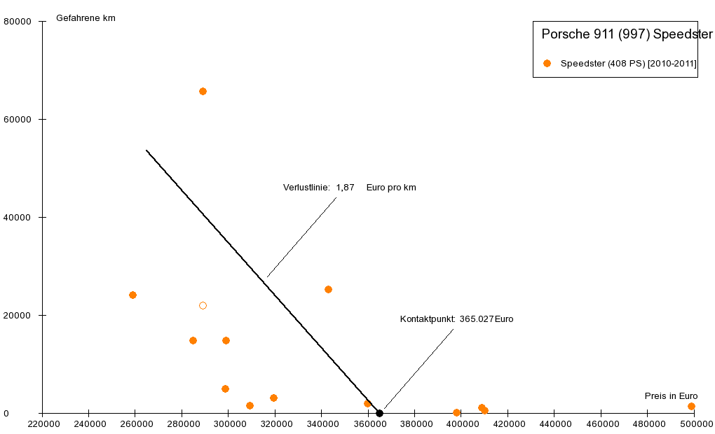 Die Verlustlinie endet unten auf der x-Achse am sogenannten Kontaktpunkt, hier bei 365.027 €. Der Kontaktpunkt ist für Fahrzeuge interessant, für die noch Neufahrzeuge angeboten werden. Mit dem Wert des Kontaktpunktes lässt sich der unmittelbare Neuwagenwertverlust abschätzen. Beim Kauf eines Neuwagens, also bei der Umwandlung eines Neuwagens in einen Gebrauchtwagen findet in der Regel ein besonders hoher, überproportionaler Wertverlust statt. Dies äußert sich in der Graphik regelmäßig so, dass die meisten Neuwagenangebote auf der x-Achse rechts vom Kontaktpunkt liegen. Findet man nun ein Angebot eines Neuwagens links vom Kontaktpunkt, bedeutet dies, dass beim Kauf dieses Fahrzeuges kein Neuwagenwertverlust auftritt. Der Grund dafür, dass dieses Angebot so preiswert ist, kann allerdings in der geringeren Ausstattung dieses Neufahrzeugs zu suchen sein.