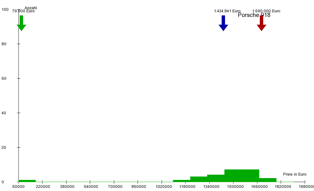 Insgesamt werden oder wurden 27 gebrauchte Wagen angeboten. Davon wurden im Beobachtungszeitraum seit dem 01.10.2017, d.h. in 9 Monaten 19 Wagen verkauft. Dies bedeutet einen durchschnittlichen Umsatz von ca. 0 Wagen pro Woche. Das Durchschittsalter beträgt 3 Jahre und 2 Monate. Dies bedeutet bei einer durchschnittlichen Gesamtfahrleistung eines Porsche 918 von 6.075 km eine durchschnittliche Kilometerleistung von 1.914 km pro Jahr. Der Durchschnittspreis der Angebote beträgt: