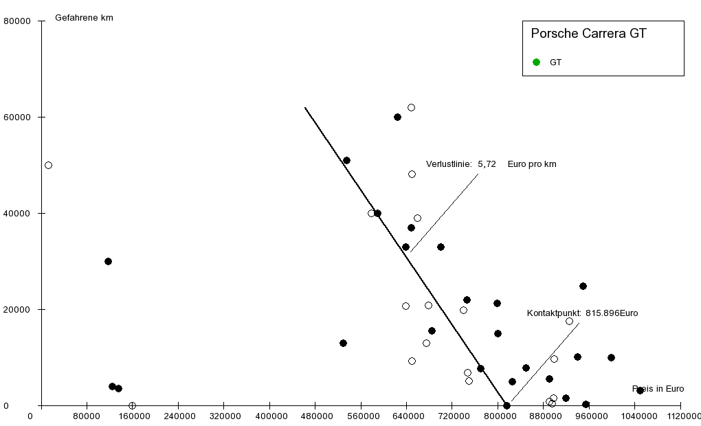Die Verlustlinie endet unten auf der x-Achse am sogenannten Kontaktpunkt, hier bei 815.896 €. Der Kontaktpunkt ist für Fahrzeuge interessant, für die noch Neufahrzeuge angeboten werden. Mit dem Wert des Kontaktpunktes lässt sich der unmittelbare Neuwagenwertverlust abschätzen. Beim Kauf eines Neuwagens, also bei der Umwandlung eines Neuwagens in einen Gebrauchtwagen findet in der Regel ein besonders hoher, überproportionaler Wertverlust statt. Dies äußert sich in der Graphik regelmäßig so, dass die meisten Neuwagenangebote auf der x-Achse rechts vom Kontaktpunkt liegen. Findet man nun ein Angebot eines Neuwagens links vom Kontaktpunkt, bedeutet dies, dass beim Kauf dieses Fahrzeuges kein Neuwagenwertverlust auftritt. Der Grund dafür, dass dieses Angebot so preiswert ist, kann allerdings in der geringeren Ausstattung dieses Neufahrzeugs zu suchen sein.